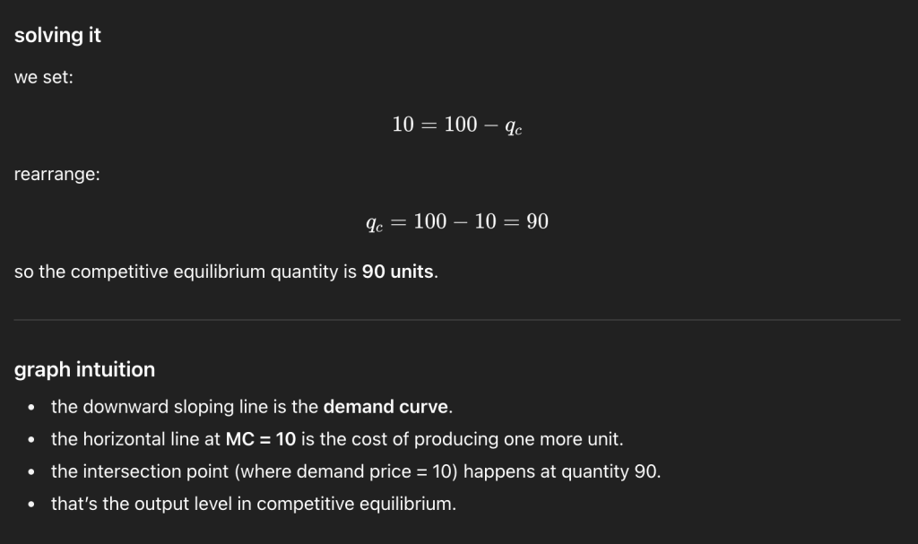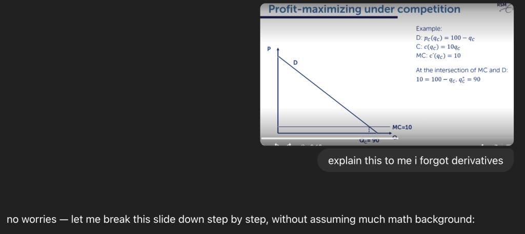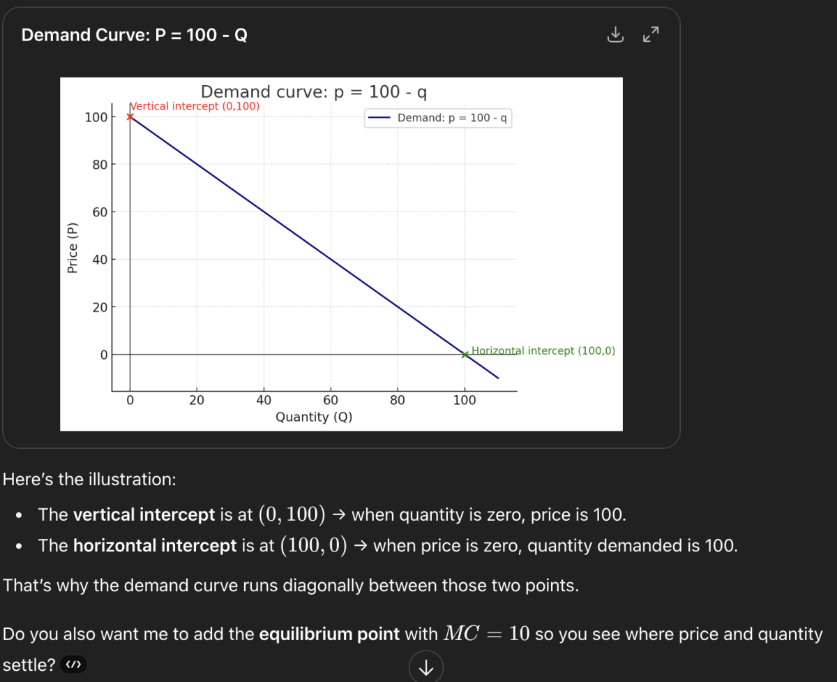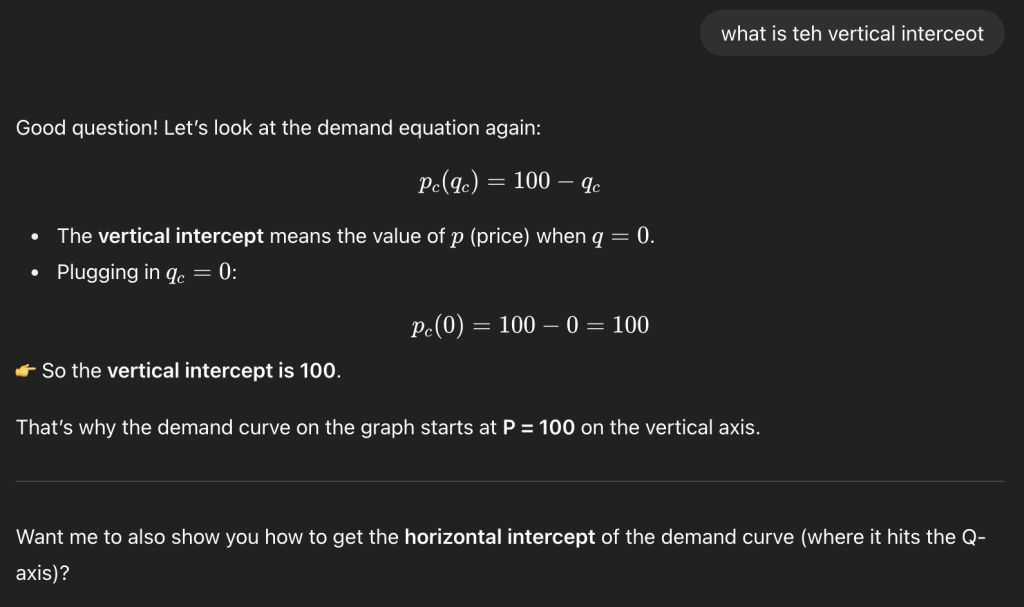 I love this Sebastian! It’s really nice that you shared the actual chat, super relatable and honestly nothing embarrassing about asking what the vertical intercept is (I literally asked the same question the first time I saw that demand curve haha). Your point about paying for ChatGPT and wanting to get real value out of it also makes total sense. When I thought about it, in high school I spent almost the same amount for one or two hours of private math tutoring what I pay now as a monthly subscription fee… and now you basically get a tutor that answers unlimited questions at 2 a.m. with patience level of 100. That is a pretty good deal if you ask me.