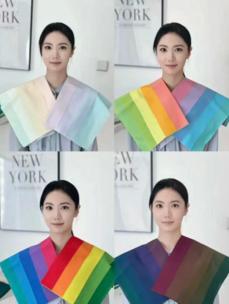 These years, a beauty test has become popular in South Korea and then in east Asia, which is called color analysis. Color analysis is a method of image management that classifies people into four seasonal types—spring, summer, autumn, and winter. At first, beauty clinic started with physical colorful clothes. They offer clothes of various clothes and make customers wear them. By comparing and analyzing the visual effect that colors combined the skin tone, hair color, and eye color, the customers will get personal style suggestions. For example, individuals with a warm-toned spring type suit bright yellows and oranges, while those with a cool-toned winter type are better suited to highly saturated blues and reds.