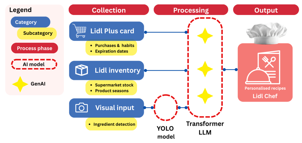 LidlChef integrates a transformer-based LLM that acts as an intelligent meal-planning assistant. Taking into account a user’s purchase history and currently available ingredients, the system generates personalized recipes. Whether prioritizing organic ingredients, a vegetarian dish, a meal for an entire family, or religious food preferences, the flexibility of GenAI helps plan the right meal for everyone. With the help of computer vision models the app enables users to effortlessly keep track of their food inventory. By prioritizing ingredients based on expiry dates, LidlChef helps households reduce their food waste, supporting the promise of “conserving resources”.