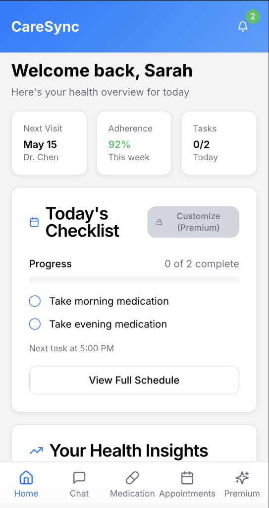 For patients, a personal health companion translates those notes into clear language, offers medication reminders, and provides a quick symptom checker that advises whether contact with a general practitioner is necessary. Furthermore, the CareSync app provides an AI assistant that is available around the clock for support and guidance. Premium features provide better insights with detailed explanations and analytical summaries. The platform does more than automate tasks. It connects both sides through shared context and feedback, so that every approved note and every patient rating improves future guidance.
