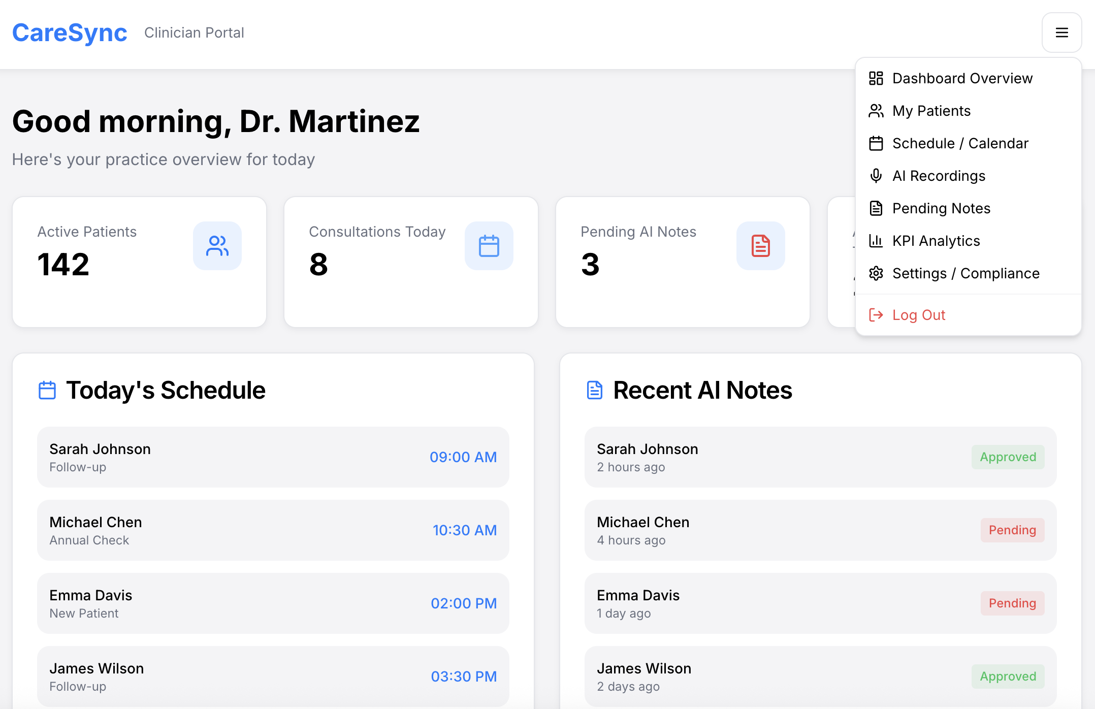 CareSync is a two-sided platform that supports healthcare professionals and patients within one ecosystem. For doctors, an AI assistant listens during consultations, transcribes the conversation, and produces structured notes in a SOAP (symptoms, observations, diagnosis, and treatment plan) format that can be reviewed and approved. The goal is to return time to clinical work and improve documentation quality.