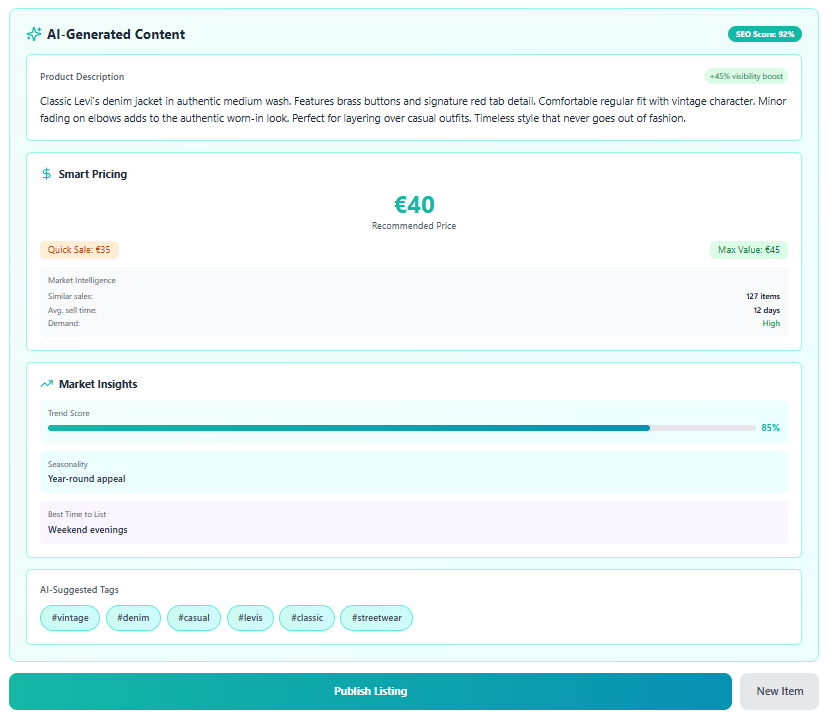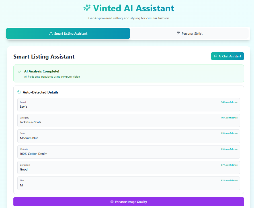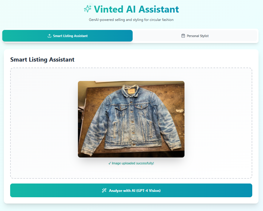 When building the prototype on the seller side, automation tools such as image recognition, AI-generated product descriptions, and dynamic pricing recommendations reduce the hassle of listing items, encouraging more users to sell rather than throw away unwanted clothing. On the buyer side, intelligent discovery and outfit completion recommendations transform the platform into a personalized styling ecosystem that promotes reuse and creative combination of existing garments. Together, these innovations help extend the lifecycle of clothing and make sustainable fashion more accessible and appealing to a broader audience, aligning the profitability of Vinted with positive environmental impact.