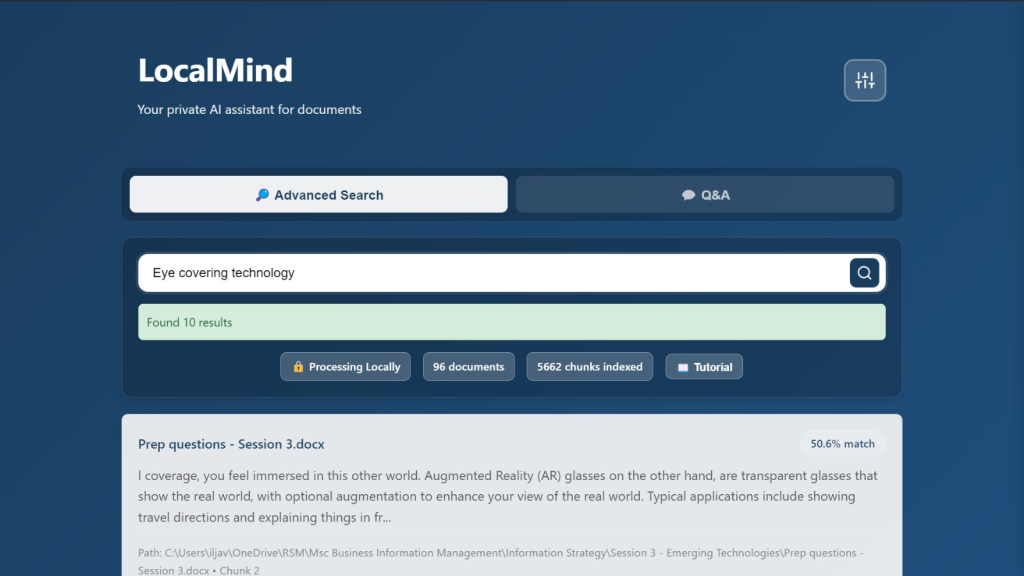 To solve this, our team designed LocalMind, which enables users to efficiently query the their files on meaning. You can type a query such as, “rental contract” and it will know what you mean and find the file, even if it is actually called “lease agreement”. It can even query and across languages. But the app does more than search. It can summarize documents and answer questions based on the content it finds, using Retrieval Augmented Generation (RAG) linked to an LLM. Instead of opening every file, you can retrieve specific information instantly with quotes and sourcing for verification. This saves time and helps users focus on actual work, rather than looking for files.