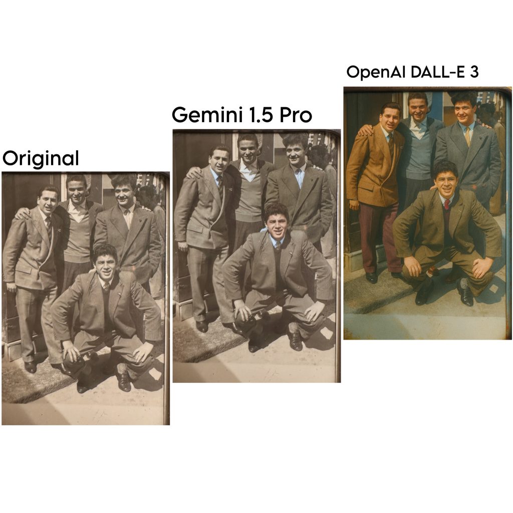I utilised two different AI tools: Gemini 1.5 Pro and DALL·E 3. Gemini 1.5 Pro impressed me with how naturally it handled portraits. In close-ups, it maintained the context of light and natural skin tones, revealing subtle details like the warmth in my grandfather’s face, making his eyes shine. But when it came to group photos, it struggled to identify the characters, resulting in a bust with a dash of blue.